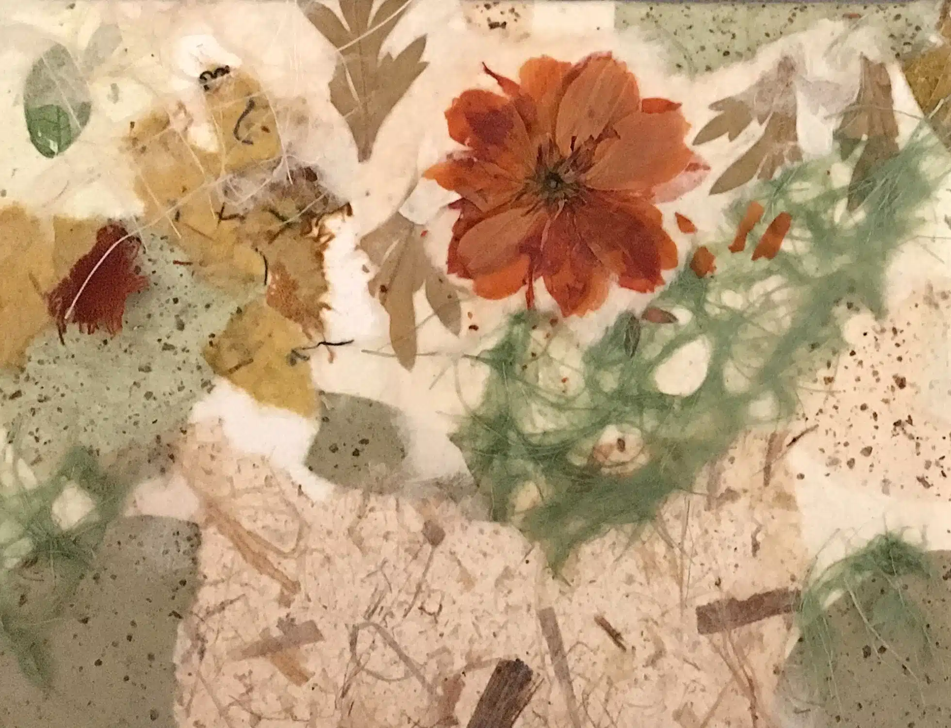 Using a mix of fall colored papers, this artistic organic collage uses a combination of Black Ink papers from Japan and Thailand, including ogura lace, natural banana fiber paper and natural floral and leaf inclusions.