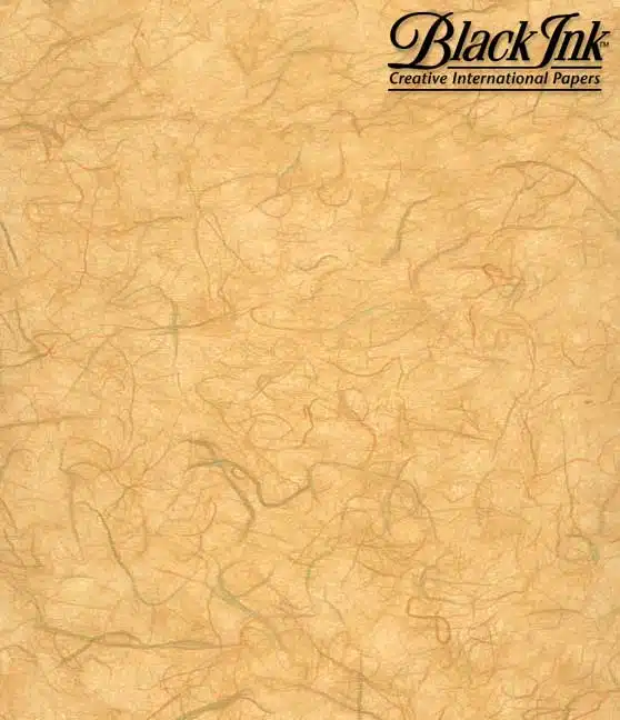 This golden hued unryu paper features strands of warm, golden, peachy colored fibers, as well as occasional strands of sage and olive greens. Select the enlarge feature to see more of the paper’s strands of color.