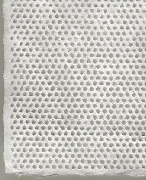 Mini-circles measuring approximately 1/4″ each, vary in shape and size throughout this textured honeycomb design. While some of the circled openings may be slightly filled in, showing off the feathery mulberry pulp in this handmade paper, the majority of the circles are more “see-through”. Textured on the front side and smooth on the back, this paper lends itself to many art applications. A perfect choice for use in layered projects such as custom invitations, book arts, collage and more.