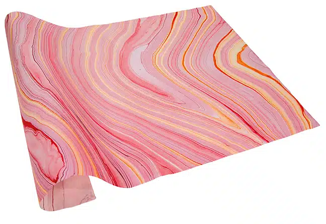 Every sheet of this gorgeous handmade marble is unique, with swirling muted tones of coral pinks and sunset orange. The mulberry base paper is initially machine made from kozo fibers and short pulp, then hand-marbled by floating each sheet on top of a bath of swirling oil colors and lifted carefully to reveal the swirling marbled pattern, then set aside to dry. A light text weight, this smooth mulberry paper folds beautifully for origami, book arts and more.