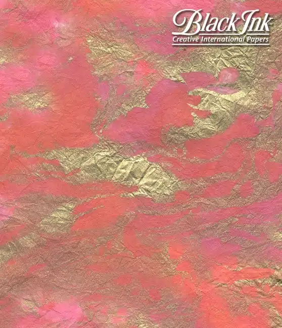 Sweet sherbert colors of pinks and peach blend softly together, while accented with rich metallic gold swirls. With a crinkled texture that is as “soft as bed sheets”, this hand marbled momi paper is a favorite for book arts, fine art use and craft applications. Our momi’s are also great for stitching applications used in altered arts and collage.