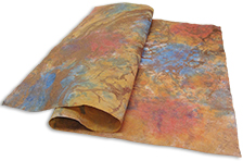 The base paper which is initially machine made from kozo and short pulp, is then hand-marbled and crumpled to feel “as soft as bed sheets”. The pattern is accomplished by skillfully adding oil based paints to float atop a tray of water, then moving the paint around to create a swirling pattern. The blank base sheet of paper is then carefully laid on top of the water, grabbing the swirling pigments, then quickly removed. The sheet is set aside to dry then  once dry, additional colors are added using a tie-dye process, giving the backside of the sheet a colorful dyed pattern of its own as well. The sheet is then crumpled to produce it’s soft cotton-like feel, and set aside to dry once more.
