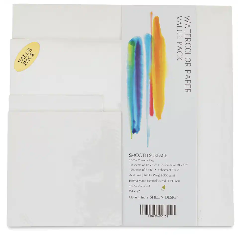 This Value Pack from Shizen Design contains a total of 39 sheets of handmade watercolor paper in four varied sheet sizes (size details listed further below.) These sheets feature a smooth surface (hot press) and are 300 gsm (140 lb.) with straight edges. All sheets are both internally and externally sized using vegan sizing, acid-free, and made of 100% recycled cotton rag, making them a favorite among artists.